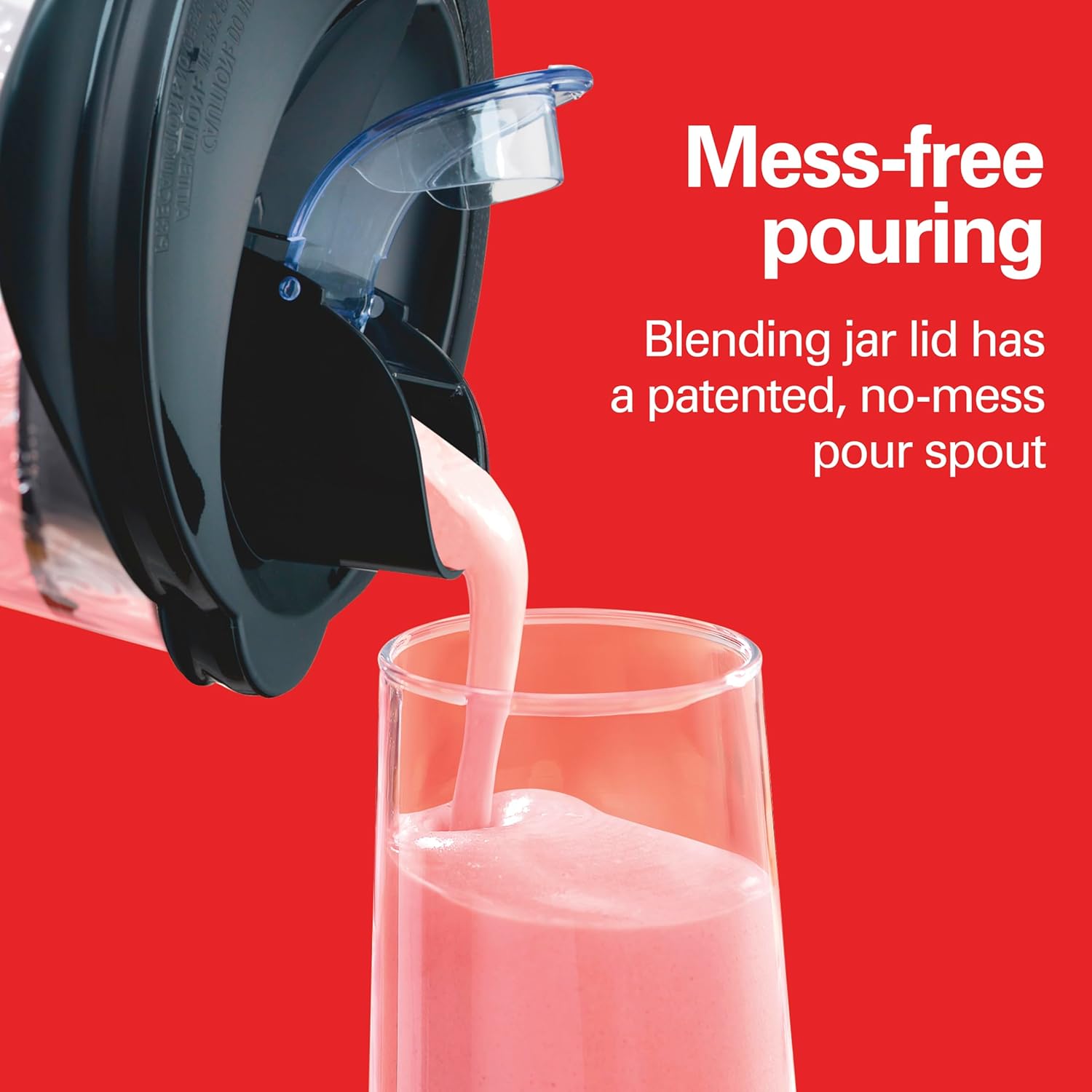 Mess-free pouring. The 40 oz. glass blending jar features a lid with a patented, mess-free pour spout that’s designed to eliminate drips and spills. The pour spout can also be used for streaming in oils and other ingredients during blending.